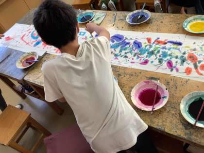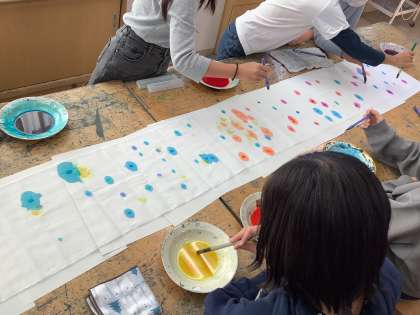 グループでの活動を楽しみ、協力しながら制作を進めていました。たこ染料を使って美しいもようがたくさんできています。