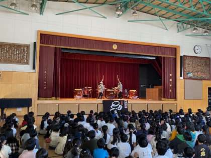 迫力ある生演奏を真剣に聴き入る子供たち。体育館に響き渡る太鼓の音を、目と耳と心と…体全体で楽しんでいました。