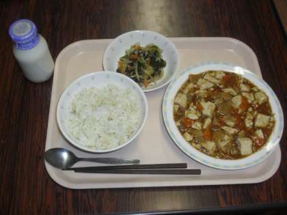 献立は、麦ごはん・四川豆腐・海藻サラダ・牛乳でした。