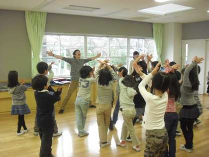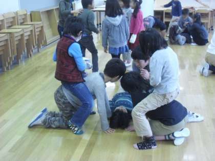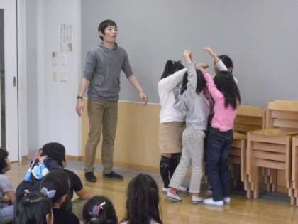 まずは、跳んだり座ったり、全身を使ってジャンケンゲームをしたりしてウォーミングアップ。体がほぐれたところで本番です。はじめに、1人2人で「椅子」になります。続いて3人で「眼鏡」に…。全身をひねる子、うつぶせる子、あるいは、ブリッジを作る子などが組み合って巨大な眼鏡ができあがります。さらに4人で「洗濯機」。複雑に組み合いながらも、手先を器用に動かして、洗濯機が動き出します。そして、最後に5人組で「お花」に…。発芽して成長し、つぼみが静かに優しく花開いていく様を5人のアイデアとチームワークで演じきります。見事な大輪がきれいに咲いたところで本日は終了。劇団員の方々から温かいお褒めの言葉もいただきました。子どもたちも大満足。来週もますます期待が高まります。