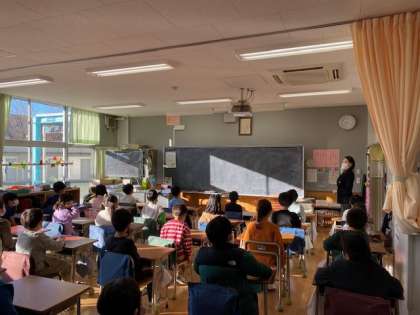 始業式では、最初に「元気な笑顔を1月10日にもってくる」という校長先生からの冬休みの宿題の確認をしました。教室では、担任の先生と目を合わせて嬉しそうに座っている光景が見られました。