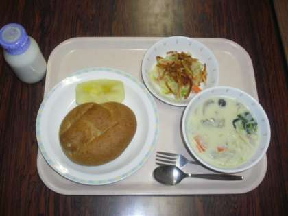 献立は、胚芽パン・もりのチャウダー・ジャガイモのハニーサラダ・リンゴ・牛乳です。