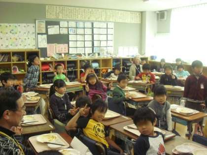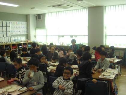 紙芝居を見せていただいた後、地域の方々を2年生の教室にお迎えし、クラスで一緒に給食を食べながら、ふれあいの時間をもちました。子どもたちははじめのうちこそ多少緊張の面持ちでしたが、次第に会話が弾んできました。学校の近所の話題、昔話などを話題に、楽しいひと時を過ごしました。