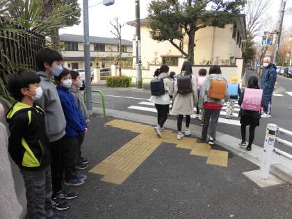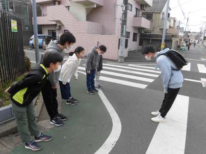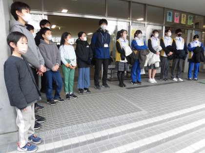 それに合わせて、計画委員会の児童も玄関前で一緒にあいさつ運動を行いました。また、地域の方との挨拶も活発になるとよいと考え、学校近くの見守り隊の方の側でもあいさつ運動をしています。