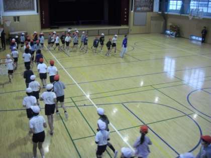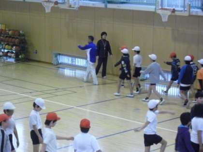 残念ながら、1校時の途中から雨が降り出してしまい体育館での実施となった「ランニング教室」。2月23日に東の子マラソンがある5年生が2校時、6年生が3校時に指導を受けました。