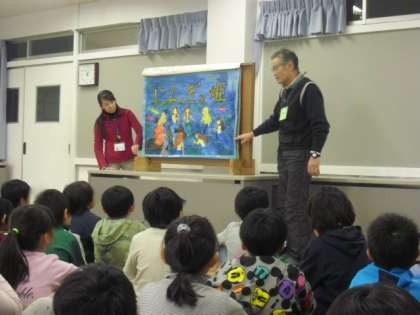 全体会では、代表の鈴木さんが大きな紙しばい「人魚姫」の読み聞かせをしてくれました。そのすてきな紙しばいに、どの子も目を輝かせていました。3年生はそのお礼に、全員でリコーダーの合奏と、歌のプレゼントをしました。