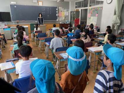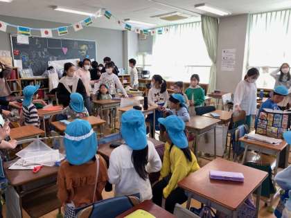 1年生の教室では、お兄さんお姉さんがどんなお勉強をしているのか興味津々。