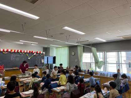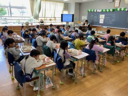 1年生も今週から給食が始まりました。約束をしっかり守って、美味しそうに食べています。