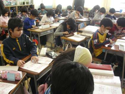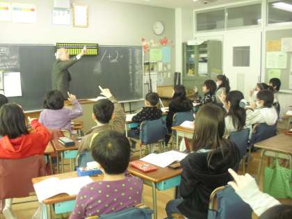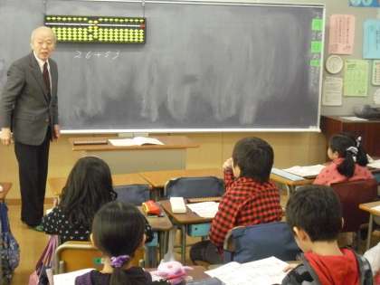 そろばんの授業風景です。そろばんの先生に来ていただき、授業を行いました。そろばんの基礎からわかりやすくていねいに教えていただき、子どもたちは集中して取り組むことができました。とっても楽しい授業で、子どもたちは、次の授業を楽しみにしています。