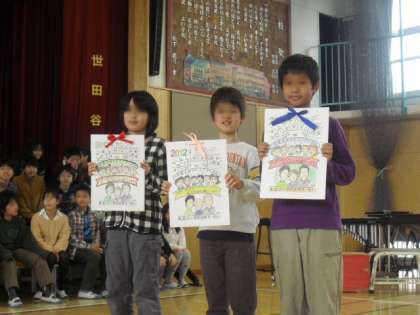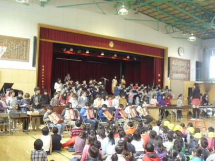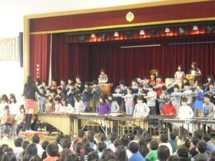 1年生から5年生が作ったカレンダーは、6年生へのプレゼントです。プレゼントをもらった6年生は、にっこり笑顔です。そして、6年生からは「アフリカンシンフォニー」の演奏をプレゼントしてもらいます。