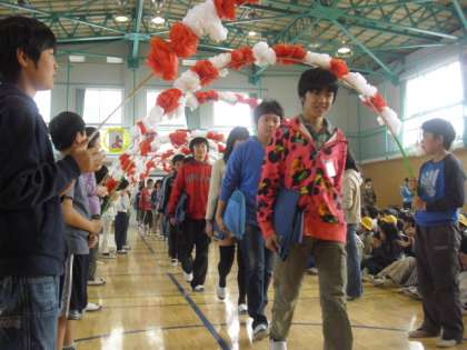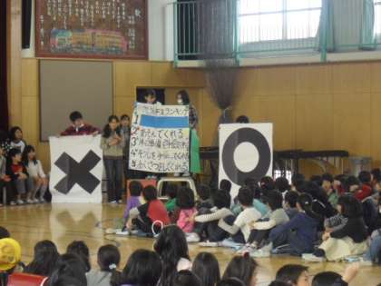 5年生の代表委員が中心となって会を進めます。卒業生は在校生の拍手とアーチで迎えられます。最初は集会委員会の「6年生クイズ」○×は、会場を盛り上げました。