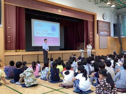 3時間目に体育館にてセーフティ教室が行われました。3年生向けに「ネット・スマホをかしこくつかおう!」と題して、東京都ファミリーeルール事務局の方がお話ししてくださいました。ネットでのトラブルに巻き込まれないように怪しいメッセージに対してはアクセスしないこと、万一の時は大人に相談すること、文字のみでのやりとりは難しいため送信する前にもう一度見直すことなど、ネットの使い方について教えていただきました。学校公開中で保護者の皆さまも参観いただきました。ぜひお家でもネットの使い方について話し合う機会としてほしいです。