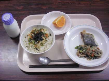 献立は、だし茶漬け・魚(鰆)の西京焼き・ナムル・せとか・牛乳です。