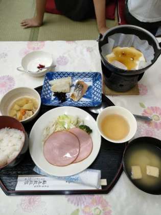 今朝のメニューは、「焼き鮭、手作り豆腐、ロースハム、肉じゃが、ご飯、味噌汁、ヨーグルト…」です。