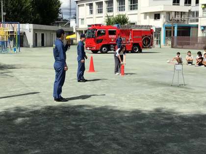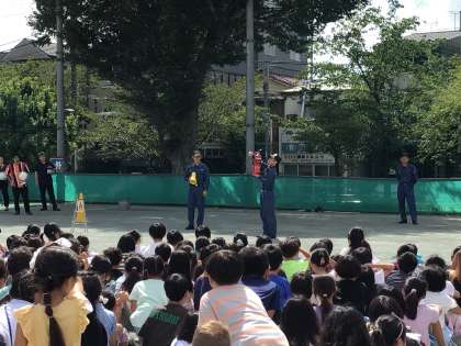 9月11日に避難訓練を行いました。今回の避難訓練では、玉川消防署新町出張所から消防隊員の方々に来ていただき、消火器の正しい使い方についてお話をしていただきました。その後、数名の先生や6年生の代表児童が消火器を使った訓練を行いました。普段はなかなか触ることのない消火器ですが、隊員の方の話をよく聞いて、正しく使うことができました。また、「火事を発見したときは、消火器を正しく使うことも大事ですが、まずは大声で火事を周りの大人に知らせてください。」とお話をしてくださいました。いざという時に行動できるように、これからも毎月の避難訓練に取り組んでいきます。