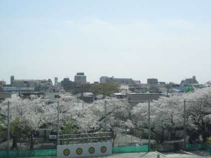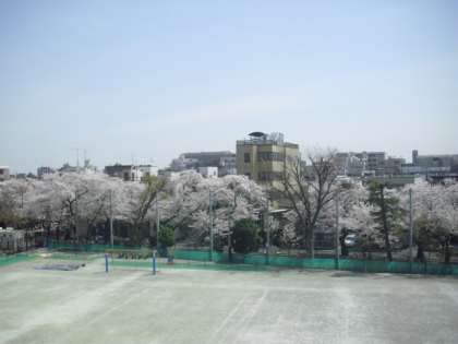 5年生の教室から呑川を眺めたところです。今日が最高の花見日和です。給食の時間はまるで、お花見給食です。ひがし百景の1番目です。