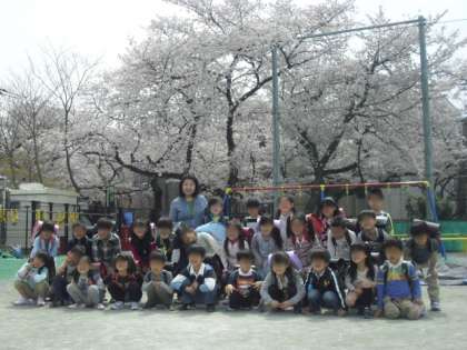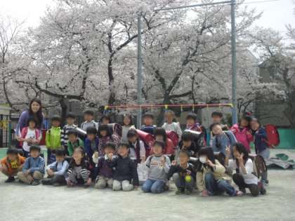 桜の花も満開、美しく咲き誇る中、3校時は校庭に出て、クラスごとに記念写真を撮りました。小学校で出会った新しいお友達と写真の隊形に並ぶこともすばやくできました。