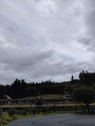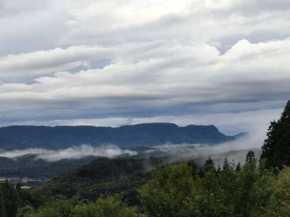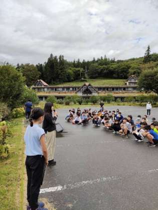 朝会は、遠くの山々を見渡せる広場でラジオ体操を行いました。