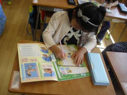 国語では、鉛筆の持ち方を練習してから、練習帳の直線や曲線等を丁寧になぞっていきました。みんなとても上手にできていました。◎です。
