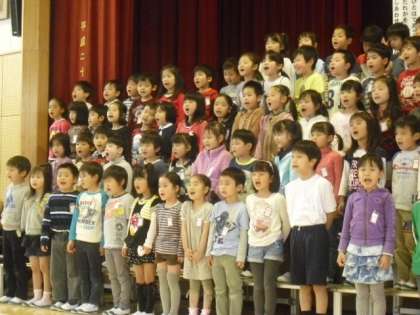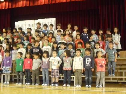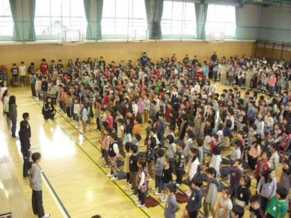 1年生からお礼の呼びかけと合唱の後、体育館フロアで並び ひがしの仲間入りをしました。最後は全員で「友達になるために」と「校歌」を元気に歌いました。