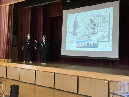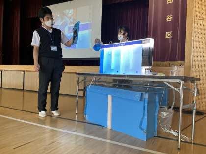 4年生では、社会科の「水はどこから」の学習の一環として東京都水道局「水道キャラバン隊」の方々をお招きし、東京都の水道水の仕組みや工夫について学習しました。