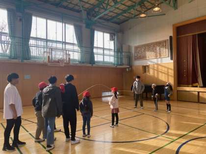 1年生と6年生の異学年交流では、一緒に長縄跳びを楽しんでいました。