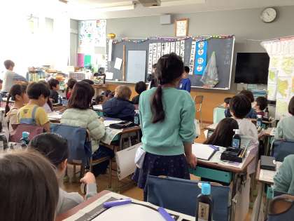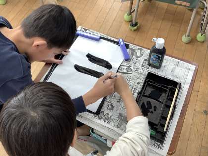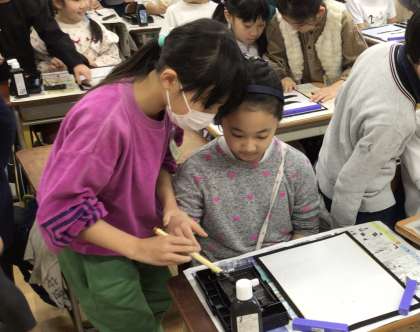 2年生と3年生で異学年交流を行いました。今回は、3年生が2年生に習字の書き方を教える「習字教室」を行いました。まず、座り方や筆の持ち方など、3年生から説明しポイントを伝えました。2年生も興味深々で分からないことを質問していました。3年生も準備を生かして、質問に丁寧に優しく答えていました。その後、実際に「ニ」という漢字を半紙に書きました。マンツーマンで2年生を教えることができた3年生も、緊張しながらも「2年生も上手に書けていた」と満足気でした。