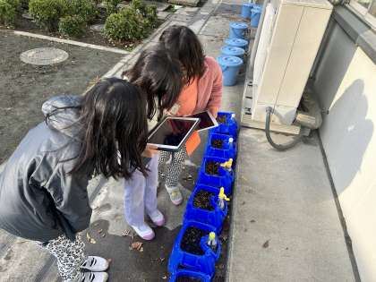 今朝は、寒くて土に霜が降りている中で、何人かの子どもたちが、芽が生えようとしているのを見つけました。「こんなに寒いのに元気に芽が出てこようとしている!」と、昨日からの変化をタブレットに記録し、自分だけの「小松菜アルバム」に記録していました。