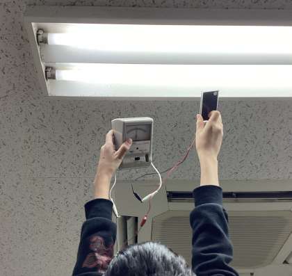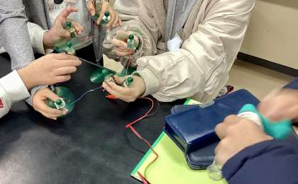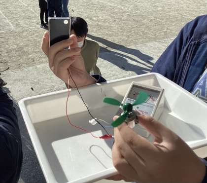 次に、光電池を使ってどうしたらプロペラが回せるかに挑戦しました。理科室の机の上では回らず、蛍光灯に近づけた子もいました。最後は、校庭に出て太陽の光で回すことができ、楽しく学ぶことができました。