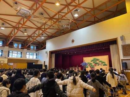 ワークショップでは、柿を食べる様子を教えていただき、体の使い方やセリフの言い方をまねしました。みんなで大声で笑う場面では、元気いっぱいの笑い声が体育館に響きました。