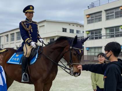 昨年度、今の6年生2名が命名した警視庁交通騎馬隊「優輝(ゆうき)」号が、くれよんタクシー出発式に合わせて東深沢小学校に来てくれました。人懐っこくて頭のいい馬だそうです。馬とのふれ合いも楽しみました。卒業間近の6年生にとって、よい思い出となりました。