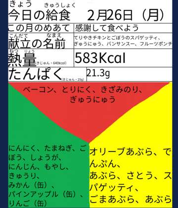 その日の給食の栄養バランスについて、教室でいつでも見てもらえるようにしたい、という児童の考えから、タブレットのロイロノートというアプリに、給食委員会の児童が作った栄耀黒板カードを配信するようになりました。