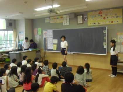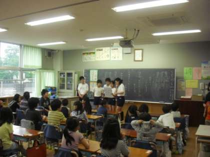 東タイムは、1年生から6年生までが一緒の班になっての活動です。今年度初めての東タイムは班のメンバーを覚えることが一番の目的です。6年生が中心となって自己紹介等を行いました。今後は、6年生がこの班で遊ぶ計画を立て実施します。“ひがし”では、このように異学年が交流していく活動をしています。高学年は低学年の子どももたちに優しく接し、低学年の子どもたちは高学年のお兄さん、お姉さんにあこがれを抱きます。豊かな心を育てるためにも東タイムの活動を大切にしていきます。