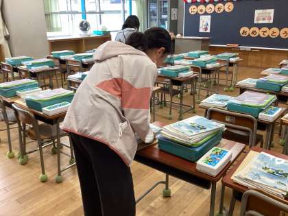 その後は、入学式の準備です。教室の飾り付け、教科書やプリントの配布など係ごとに分かれて1年生を迎える準備をしました。6年生は、最高学年として学校のリーダーになることを楽しみにしていました。今日の6年生の活躍ぶりから、今年度の活躍が楽しみです。