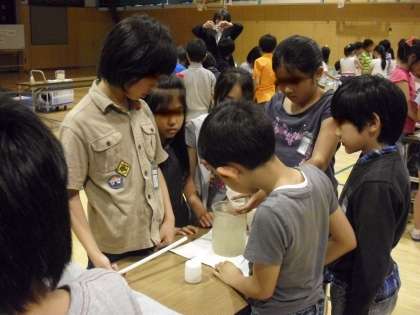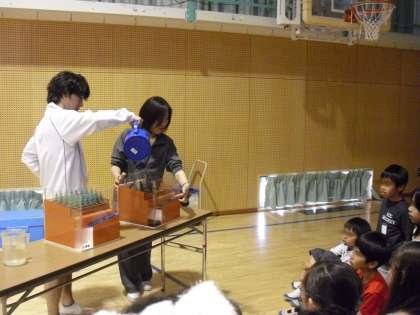後半は、グループに分かれて、濁った水がきれいになるまでの順を追いながら実験をしました。「すごくきれいな水が出てきた!!」「にごっていたのが固まった!!」「シュワシュワ音を立てている!!」など感嘆の声をあげながら、驚きの顔を見せていました。
