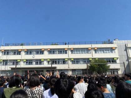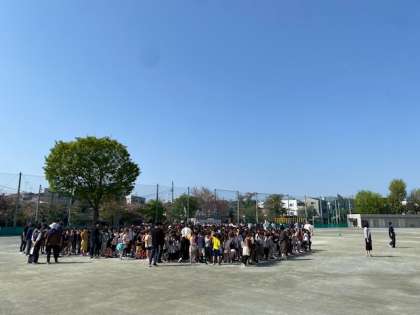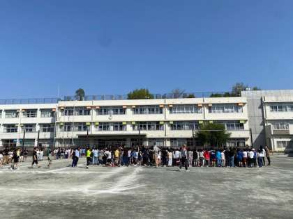 75周年を記念して、今日は1年生から6年生までが全員集合して写真を撮りました。屋上にいるカメラマンさんの合図に合わせて…どんな写真になったか楽しみです。