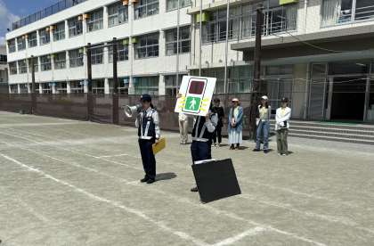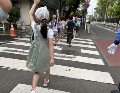 玉川警察の方に横断歩道や信号の渡り方を教えていただきました。右左を確認すること横断歩道を渡る時には手を挙げて渡ること、安全な道を選ぶことを実践を通して学びました。学校の外に出るためにPTAの方々にもお手伝いをしていただいて、安全に行くことができました。1年生も2年生も今日から実践できるようにと真剣に取り組む姿が見られました。