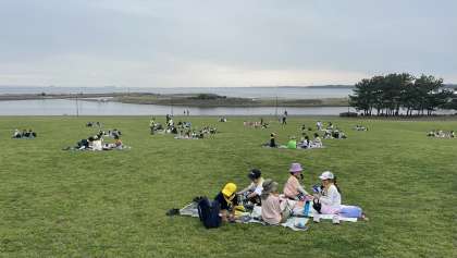 東京の海を目の前に、班ごとになって、美味しくお弁当をいただきました。持ってきたオヤツも、楽しく味わっていました。