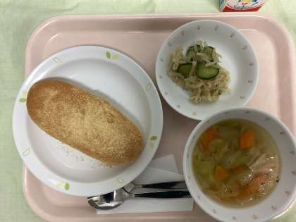 きなこ揚げパン 牛乳 マカロニスープ じゃこサラダ
