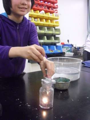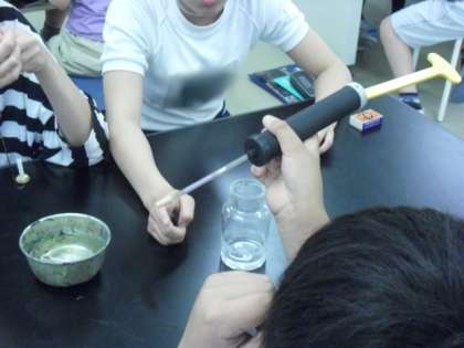 集気びんの中でろうそくを燃やすと二酸化炭素が増えることを、気体検知管を使用して確かめました。また、酸素にはものを燃やすはたらきがあることも確かめました。