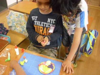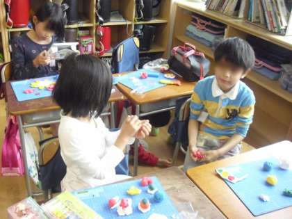 そんな中、2年生が図工の時間に紙粘土「自分だけの マグネット・マスコットを 作ろう」を楽しんでいました。紙粘土に絵の具を混ぜ、自分の作品にあった色をつけていきます。動物・植物・食物… なかには、地球をつくっている子もいました。