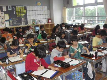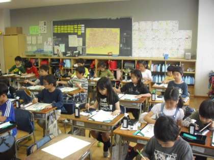 毛筆の書写は3年生からです。みんな姿勢に気を付けて、半紙に向かっています。