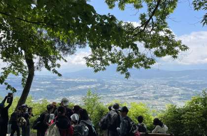 林道から登山道へ、山道を声を掛け合い励まし合って登りました。山頂に着いて眺める景色は、格別に最高でした。
