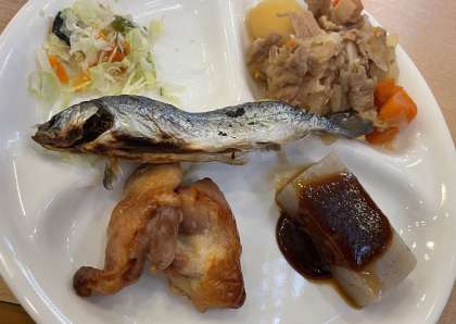 捕まえられても捕まえられなくても、夕食には採れたてのマスの塩焼きがついてきました。川場移動教室の最後の夕食を、みんなで美味しくいただきました。