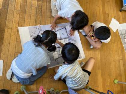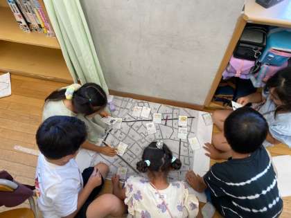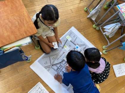 先日みんなで行った「まちたんけん」で分かったことをグループごとに話し合いながら地図にまとめています。まちのいいところがたくさん詰まったオリジナルの地図が完成しそうです。