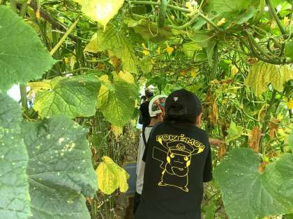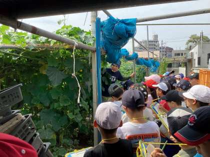 児童たちは、キュウリやトマトなどの実際に実った作物に「おお!」と声を上げながら興味津々の様子で見学していました。鈴木さんから詳しく説明をいただいている際にも、一生懸命に話を聞きながらメモをとっていました。児童からの質問にもたくさん答えていただきました。お仕事への思いや様々な工夫など、たくさんお話ししていただいたことを今後の学習へと繋げていきます。