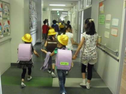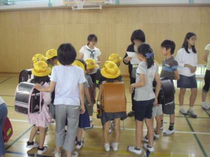 この活動を支えてくださっているのが校外委員の皆さんです。今回の地域班活動では、「高学年が低学年のお世話をする」という伝統を取り入れる方法の一つとして、体育館に集合した1年生を6年生が迎えに行く活動が取り入れられました。上級生が1年生の手を引く姿は微笑ましかったです。