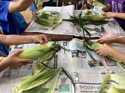 2年生が皮むきをしてくれたとうもろこしは、蒸してから今日の給食でおいしくいただきました。