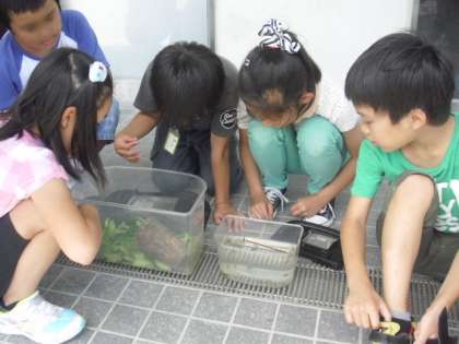 3年生が昼休みにいも虫とヤゴをもってきました。いも虫は家の近くで、ヤゴは昨日3年生の先生がプールで採ったものです。
