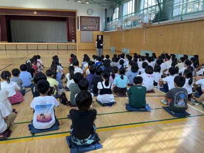 開校記念集会は2年生の明るさ、可愛さで学校の75才の誕生日を盛大にお祝いします。